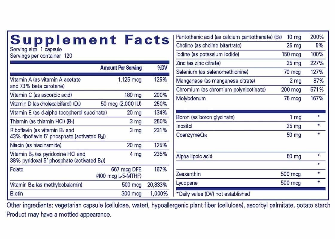Multivitamine voor vrouwen en mannen: eenmalige capsules leveren vitaminen A, B, C, D en E in zeer biologisch beschikbare vormen; CoQ10, L-5-MTHF en ALA voor antioxidantondersteuning.