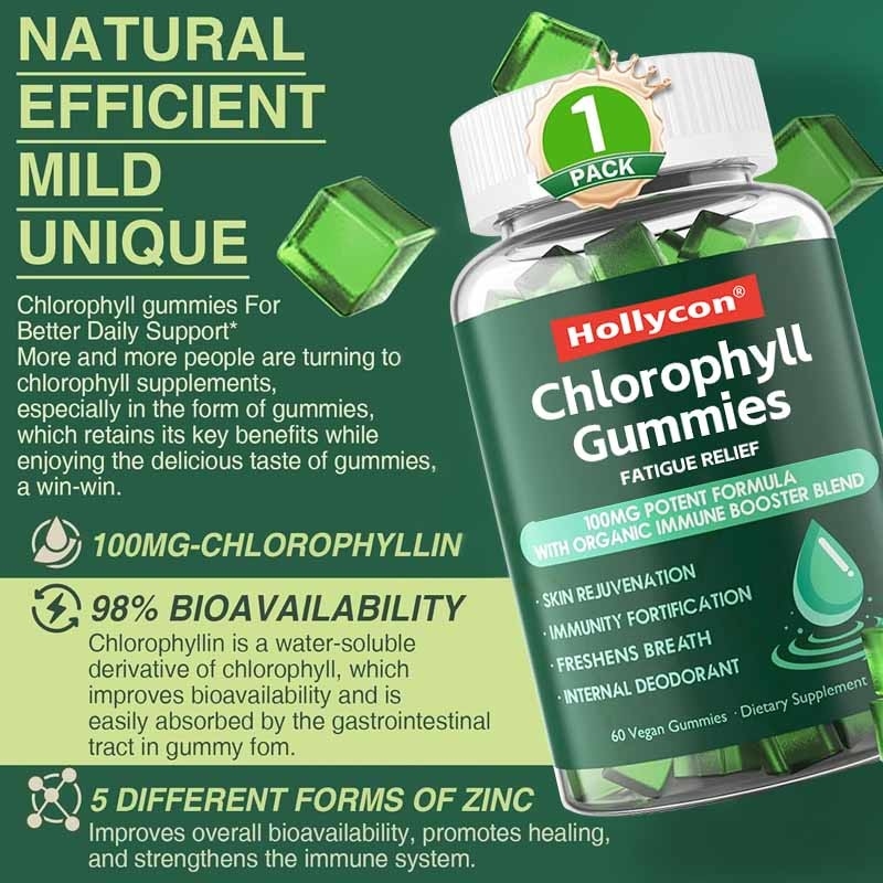 Chlorophyll GummiesHet biedt een voedzame, heerlijke manier om je immuunsysteem, spijsvertering en huid te ondersteunen.Moerbeienbladeren, deze gummies combineren krachtige vitaminen zoalsVitamine D3,C,E, enB12Het wordt gebruikt om de immuniteit te stimuleren, duurzame energie te geven en het algehele welzijn te verbeteren.Moos van de Ierse Zee,Vlees,Echinacea, enAppelazijn, versterken deze kauwgummies van nature je immuunsysteem en ondersteunen ontgifting.geen toegevoegde suikeren natuurlijke ingrediënten, deze suikervrije gummies bieden een gezonde, schuldvrije traktatie om je lichaam van binnenuit te voeden.