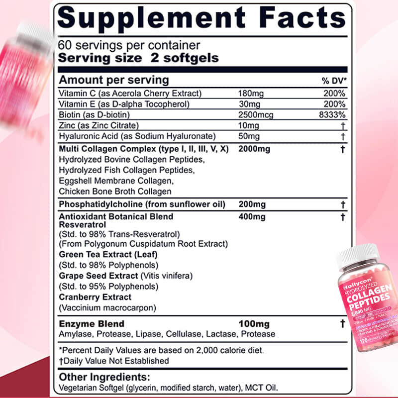 Onze collageen softgels zijn verrijkt met 4 organische plantaardige mengsels en vitamine C, E, biotine en zink om de antioxidant nog verder te verbeteren,evenals spijsverterings- en afbraakondersteunende ingrediënten om de effectieve absorptie te bevorderen.
